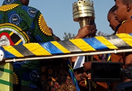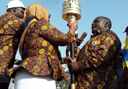 Mkuu wa Mkoa wa Katavi Bi . Mwanamvua Hoza Mrindoko akikabidhiwa Mwenge wa Uhuru na Mkuu wa Mkoa wa Rukwa Queen Sendinga katika Halmashauri ya Wilaya ya Mpimbwe...