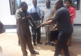Mkurugenzi Mtendaji wa Halmashauri ya Wilaya ya Mpimbwe akipokea Msaada wa Talakilishi saba kutoka Benki ya NMB MPANDA kwa ajili ya shule za sekondari za Halmashauri ya Mpimbwe...